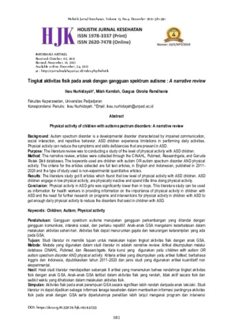 Ikeu, Nurhidayah and Milah, Kamilah and Gusgus Ghraha, Ramdhanie (2021) Tingkat aktivitas fisik pada anak dengan gangguan spektrum autisme : A narrative review. Holistik: Jurnal Kesehatan, 15 (4): 2. pp. 581-591. ISSN 1978-3337