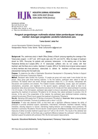 Tumiur, Sormin and Anita, Puri (2022) Pengaruh pengembangan multimedia edukasi dalam pemberdayaan keluarga memberi dukungan pengobatan penderita tuberkulosis paru. Holistik: Jurnal Kesehatan, 16 (1): 1. pp. 1-14. ISSN 1978-3337