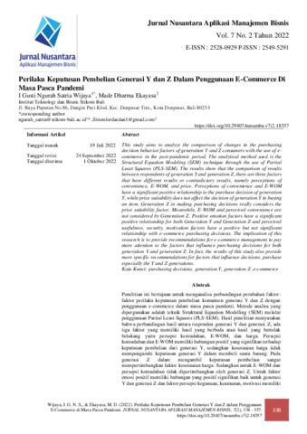 I Gusti, Ngurah Satria Wijaya and Made, Dharma Ekayasa (2022) Perilaku keputusan pembelian generasi Y dan Z dalam penggunaan e-commerce di masa pasca pandemic. Jurnal Nusantara : Aplikasi Manajemen Bisnis, 7 (2): 13. pp. 338-357. ISSN 2549-5291