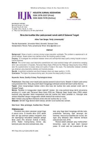 Ailine Yoan, Sanger and Ferdy, Lainsamputty (2022) Stres dan kualitas tidur pada perawat rumah sakit di Sulawesi Tengah. Holistik: Jurnal Kesehatan, 16 (1): 7. pp. 61-73. ISSN 1978-3337
