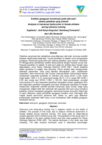 Sugiharto and Ardi Setyo Nugroho and Bambang Purwanto and Lilik Herawati (2020) Analisis gangguan menstruasi pada atlet putri selama pelatihan yang intensif. Jurnal SPORTIF: Jurnal Penelitian Pembelajaran, 6 (3): 6. pp. 612-623. ISSN 2548 – 7833