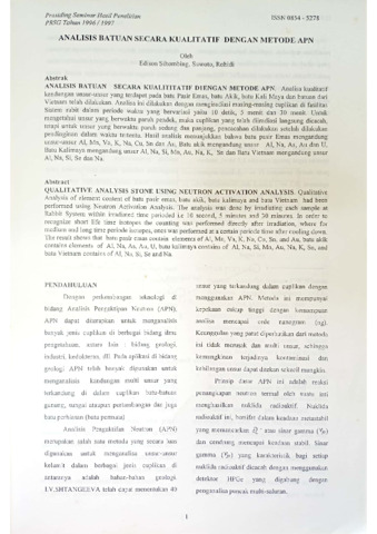 Analisis kualitatif kandungan unsur-unsur yang terdapat pada batu pasir emas, batu akik, batu kalimaya dan batuan dari Vietnam telah dilakukan. Analisa ini dilakukan dengan mengiradiasi masing-masing cuplikan di fasilitas sistem rabit dalam periode waktu yang bervariasi yaitu 10 detik, 5 menit, dan 30 menit. Untuk mengetahui unsur yang berwaktu paruh pendek, maka cuplikan yang telah diiradiasi langsung dicacah, tetapi untuk unsur yang berkatu paruh sedang dan panjang, pencacahan dilakukan setelah dilakukan pendinginan dalam waktu tetentu. Hasil analisis menunjukkan bahwa pasir batu emas mengandung unsur-unsur Al, Mn, Va, K, Na, Cu, Sn dan Au, batu akik mengandung unsur-unsur Al, Na, As, Au dan U, batu kalimaya mengandung unsur-unsur Al, Na, Si, Mn, Au, Na, K dan Sn, dan batu vietnam mengandung unsur Al, Na, SI, Se dan Na.