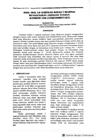 Verifikasi Indeks T regional Indonesia dapat dilakukan dengan menggunakan jaringan stasiun radio sistem Automatic Link Establishment (ALE). Berdasarkan kajian awal yang dilakukan, proses verifikasi dapat menunjukkan persentasi kesesuaian maupun ketidak-sesuaian antara data hasil prediksi frekuensi dengan modus data uji komunikasi radio. Dari perbandingan yang dilakukan dengan menggunakan 3 sirkuit komunikasi pada bulan Maret dan April 2012, diperoleh persentase kesesuaian antara data hasil prediksi dengan UM komunikasi yang berada pada rentang 76, 1 - 92,6%.Sedangkan ketidak-sesuaian'antara hasil prediksi dengan uji komunikasi yangdiperoleh berada pada rentang 7,4 - 23,9%. Berdasarkan analisis dari besarnya persentase ketidak-sesuaian tersebut diketahui bahwa salah satu faktor penyebab tidak sesuainya data disebabkan oleh adanya lapisan E sporadis (Es) yang tidak termasuk dalam perhitungan prediksi yang dilakukan. Tidak tercakupnya kemunculan lapisan Es pada perhitungan prediksi frekuensi oleh software ASAPS dapat dicatat sebagai faktor yang perlu diperhitungkan dalam menentukan persentase dari ketidak-sesuaian data yang diperoleh. Dengan hasil kajian awal ini, verifikasi indeks T regional dengan data uji komunikasi radio dapat dinyatakan layak untuk dilakukan.
