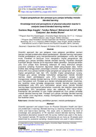 Gustiana Mega Anggita and Tandiyo Rahayu (2020) Tingkat pengetahuan dan persepsi guru penjas terhadap metode blended learning. Jurnal SPORTIF: Jurnal Penelitian Pembelajaran, 6 (3): 12. pp. 699-712. ISSN 2548 – 7833