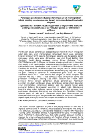 Slamet Junaidi and Nurhasan and Edy Mintarto (2020) Penerapan pendekatan situasi pertandingan untuk meningkatkan teknik passing atas dan passing bawah permainan bolavoli pada atlet elit putri. Jurnal SPORTIF: Jurnal Penelitian Pembelajaran, 6 (3): 19. pp. 807-820. ISSN 2548 – 7833