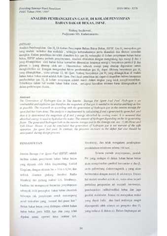 Gas H2 merupakan gas yang mudah terbakar dan meledak, sehingga keberadaannya perlu dianalisis dan ditekan serendah mungkin. Dalam penelitian ini telah dianalisis laju gas H2 terbangkit di kolam penyimpanan bahan bakar bekas, ISFSF selama periode penyimpanan. Analisis dilakukan dengan menghitung laju energi beta dan alfa yang dibangkitkan oleh bahan bakar kemudian ditentukan besarnya energi (banyaknya partikel beta dan photon alfa) yang diserap oleh air. Diasumsikan seluruh energi yang diserap digunakan untuk menghidrolisa air. Dengan mengetahui faktor pembentukan gas H2 dapat dihitung banyaknya gas H2 yang dibangkitkan, yaitu sebesar 12,06 l/jam. Dari hasil penelitian ini dapat disimpulkan bahwa kecepatan pembentukan gas H2 di kolam penyimpanan masih dalam tingkat yang tidak menghawatirkan. Sebaliknya dalam hal wadah bahan bakar cacat, antisipasi kenaikan tekanan harus diintegrasikan di dalam perhitungan desain.