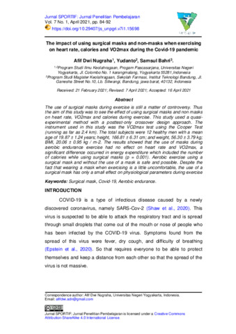 Afif Dwi Nugraha and Yudanto and Samsul Bahri (2021) The impact of using surgical masks and non-masks when exercising on heart rate, calories and VO2max during the Covid-19 pandemic. Jurnal SPORTIF: Jurnal Penelitian Pembelajaran, 7 (1): 6. pp. 84-92. ISSN 2548 – 7833