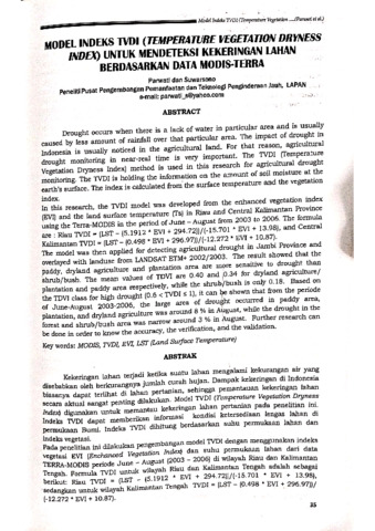 Pada penelitian ini dilakukan pengembangan model TVDI dengan menggunakan indeks vegetasi EVI (Enchanced Vegetation Index) dan suhu permukaan lahan dari data TERRA-MODIS periode June - August (2003-2006) di wilayah Riau dan Kalimantan Tengah. Formula TVDI untuk wilayah Riau dan Kalimantan Tengah adalah sebagai berikut: Riau TVDI (LST (5.1912 EVI + 294.72))/(-15.701 EVI+ 13.98), sedangkan untuk wilayah Kalimantan Tengah TVDI (LST-(0.498 EVI+ 296.97))/ (-12.272 EVI + 10.87).