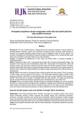 Fitri Yanti and Dina Dwi Nuryani and Dhiny Easter Yanti (2022) Peningkatan pengetahuan dengan menggunakan media video dan booklet pada klien yang menjalani kemoterapi. Holistik: Jurnal Kesehatan, 16 (3): 2. pp. 204-214. ISSN 1978-3337