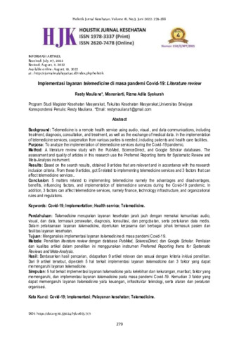 Resty Mauliana and Misnaniarti and Rizma Adlia Syakurah (2022) Implementasi layanan telemedicine di masa pandemi Covid-19: Literature review. Holistik: Jurnal Kesehatan, 16 (3): 10. pp. 279-288. ISSN 1978-3337