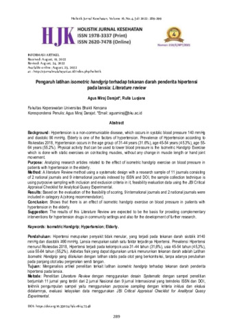 Agus Miraj Darajat and Rulla Luqiana (2022) Pengaruh latihan isometric handgrip terhadap tekanan darah penderita hipertensi pada lansia: literature review. Holistik: Jurnal Kesehatan, 16 (4): 1. pp. 289-299. ISSN 1978-3337