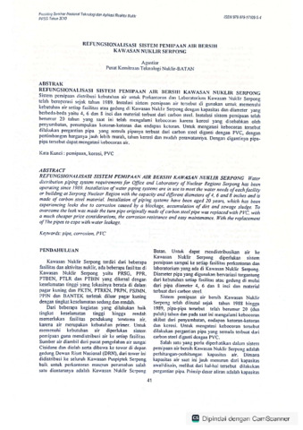 Sistem pemipaan distribusi kebutuhan air untuk Perkantoran dan Laboratorium kawasan Nuklir Serpong telah beroperasi sejak tahun 1989. Instalasi sistem pemipaan air tersebut di gunakan untuk memenuhi kebutuhan air setiap fasilitas atau gedung di Kawasan Nuklir Serpong dengan kapasitas dan diameter yang berbeda-beda yaitu 4, 6 dan 8 inci dan material terbuat dari carbon steel. Instalasi sistem pemipaan telah berumur 20 tahun yang saat ini telah mengalami kebocoran karena korosi yang disebabkan oleh penyumbatan, penumpukan kotoran-kotoran dan endapan kotoran. Untuk mengatasi kebocoran tersebut dilakukan penggantian pipa yang semula pipanya terbuat dari carbon steel diganti dengan PVC, dengan pertimbangan harganya jauh lebih murah, tahan korosi dan mudah perawatannya. Dengan digantinya pipa-pipa tersebut dapat mengatasi kebocoran air.