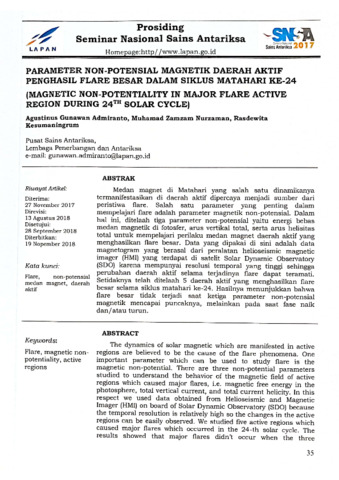 Agustinus, Gunawan Admiranto and Muhamad, Zamzam Nurzaman and Rasdewita, Kesumaningrum (2018) Parameter Non-Potensial magnetik daerah aktif penghasil flare besar dalam siklus matahari ke-24. In: Seminar Nasional Sains Antariksa 2017: Sains Antariksa untuk Indonesia Maju dan Mandiri, 22 November 2017, Bandung.