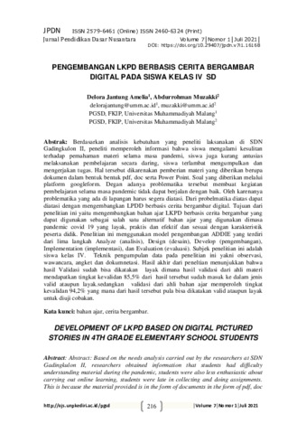 Delora Jantung, Amelia and Abdurrohman, Muzakki (2021) Pengembangan LKPD berbasis cerita bergambar digital pada siswa kelas IV SD. Jurnal Pendidikan Dasar Nusantara, 7 (1): 15. pp. 216-232. ISSN 2460-6324