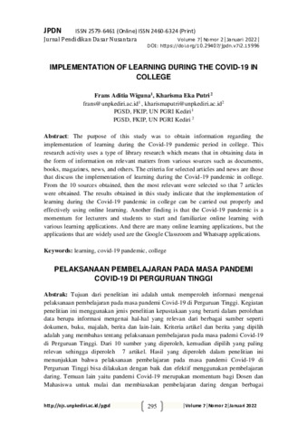 Frans Aditia, Wiguna and Kharisma Eka, Putri (2022) Implementation of learning during the Covid-19 in college. Jurnal Pendidikan Dasar Nusantara, 7 (2): 5. pp. 295-304. ISSN 2460-6324