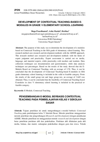 Mega, Prasrihamni and Arita, Marini and Herlina, Herlina (2022) Development of contextual teaching-based e-modules in grade V elementary school learning. Jurnal Pendidikan Dasar Nusantara, 7 (2): 14. pp. 415-433. ISSN 2460-6324