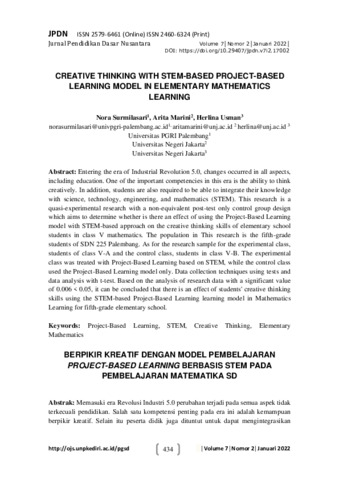 Nora Surmilasari and Arita Marini and Herlina Usman (2022) Creative thinking with STEM-based Project-Based Learning model in elementary mathematics learning. Jurnal Pendidikan Dasar Nusantara, 7 (2): 15. pp. 434-444. ISSN 2460-6324