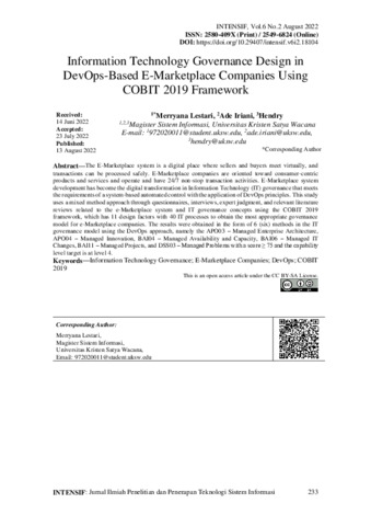 | Uncontrolled Keywords: | Information Technology Governance, E-Marketplace companies, DevOps, COBIT |
