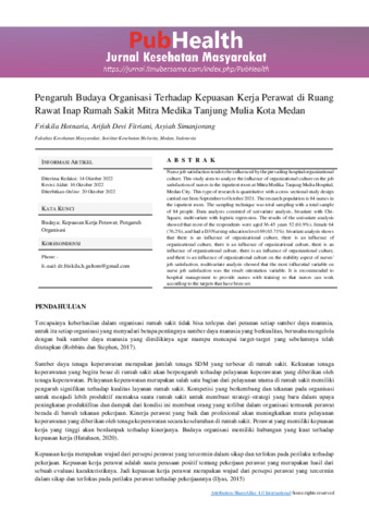 Friskila, Hotnaria and Arifah, Devi Fitriani and Asyiah, Simanjorang (2022) Pengaruh budaya organisasi terhadap kepuasan kerja perawat di ruang rawat inap Rumah Sakit Mitra Medika Tanjung Mulia Kota Medan. Pubhealth Jurnal Kesehatan Masyarakat, 1 (2): 4. pp. 144-149. ISSN 2830-7224