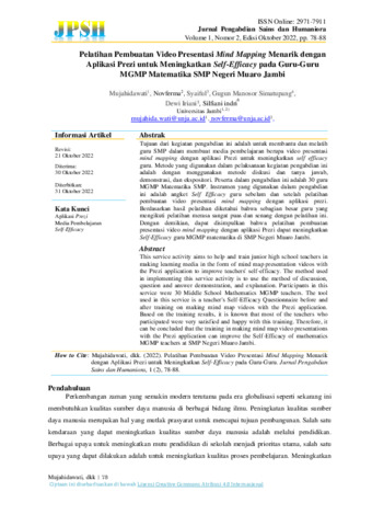 Mujahidawati, Mujahidawati and Novferma, Novferma and Syaiful, Syaiful and Gugun, Manosor Simatupang and Dewi, Iriani and Silfiani, Indri (2022) Pelatihan pembuatan video presentasi mind mapping menarik dengan aplikasi prezi untuk meningkatkan self-efficacy pada guru-guru MGMP Matematika SMP Negeri Muaro Jambi. Jurnal Pengabdian Sains dan Humaniora, 1 (2). pp. 78-88. ISSN 2961-7901