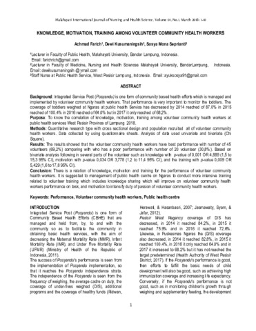 Achmad, Farich and Dewi, Kusumaningsih and Sosya Mona, Seprianti (2018) Knowledge, motivation, training among volunteer community health workers. Malahayati International Journal of Nursing and Health Science, 1 (1): 1. pp. 1-10. ISSN 2620-9152