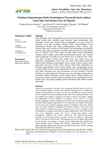 Praddnya, Paramita Hapsari and Agus, Efendi and R., Adi Deswijaya and Harsono, Harsono and Tri, Widiatmi (2022) Pelatihan pengembangan media pembelajaran wayang berbasis aplikasi game bagi guru bahasa Jawa di Magetan. Jurnal Pengabdian Sains dan Humaniora, 1 (2). pp. 50-57. ISSN 2961-790
