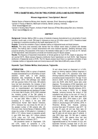 Wirawan, Anggorotomo and Malahayati, University and Masroni, Masroni (2018) Type 2 Diabetes mellitus on triglyceride levels and blood pressure. Malahayati International Journal Of Nursing And Health Science, 1 (1): 2. pp. 11-16. ISSN 2620-9152