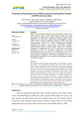 Made, Santiari and Maria, Paulin Saridewi and Feliksitas, Angel Masing and Lidwina, Felisima Tae and Kamaluddin, Kamaluddin (2022) Peningkatan pengetahuan peserta didik mengenai pengelompokkan sampah di SMPS Gita Surya Eban. Jurnal Pengabdian Sains dan Humaniora, 1 (2). pp. 66-71. ISSN 2961-7901