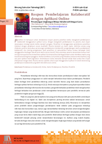 Dwi Sulisworo and Dian, Dian Artha Kusumaningtyas (2022) Respon pembelajaran kolaboratif dengan aplikasi online. Bincang Sains dan Teknologi, 1 (1): 2. pp. 12-17. ISSN 2961-8932