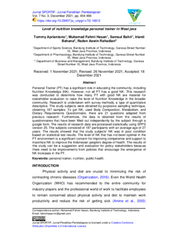 Tommy Apriantono and Muhamad Fahmi Hasan and Samsul Bahri and Irianti Bahana and Raden Aswin Rahadian (2021) Level of nutrition knowledge personal trainer in West java. Jurnal SPORTIF: Jurnal Penelitian Pembelajaran, 7 (3): 9. pp. 454-466. ISSN 2548 – 7833