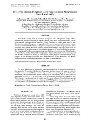 Muhammad, Advi Hamidin and Hamid, Abdillah and Sulaeman, Deni Ramdani (2022) Prototype stasiun pengisian daya ponsel seluler mengunakan solar panel 20Wp. Jurnal Teknik Mesin, 19 (2): 1. pp. 27-31. ISSN 1410-9867