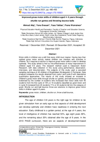 Ahmad Atiq and Yona Evasari and Yoas Yafdas and Frans Womsiwor (2021) Improved gross motor skills of children aged 4- 6 years through shuttle run games and throwing bounce balls. Jurnal SPORTIF: Jurnal Penelitian Pembelajaran, 7 (3): 11. pp. 480-493. ISSN 2548 – 7833