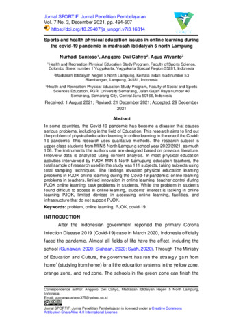 Nurhadi Santoso and Anggoro Dwi Cahyo and Agus Wiyanto (2021) Sports and health physical education issues in online learning during the covid-19 pandemic in Madrasah Ibtidaiyah 5 North Lampung. Jurnal SPORTIF: Jurnal Penelitian Pembelajaran, 7 (3): 12. pp. 494-507. ISSN 2548 – 7833