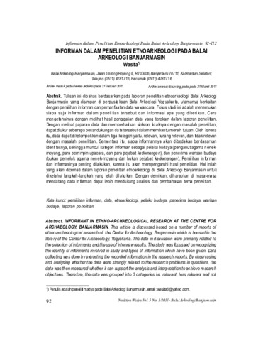 Wasita (2011) Informan dalam penelitian Etnoarkeologi pada Balai Arkeologi Banjarmasin. Naditira Widya, 5 (1): 7. pp. 92-112. ISSN 1410 - 0932