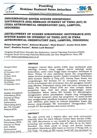 Wahyu, Sasongko Putro and Robiatul, Muztaba and Wirid, Birastri and Annisa, Novia Indra Putri and Nindhita, Pratiwi and Hakim, Luthfi Malasan (2018) Pengembangan Sistem Sudden Ionospheric Disturbance (SID) berbasis Internet of Things (Iot) di Itera Astronomical Observatory (IAO), Lampung, Indonesia. In: "Seminar Nasional Antariksa 2017" Sains Antariksa untuk Indonesia Maju dan Mandiri, 22 November 2017, Bandung.