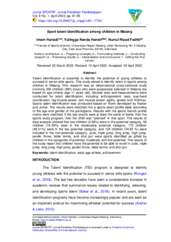 Talent Identification is essential to identify the potential of young athletes to succeed in senior elite sports. This study aimed to identify talent in sports among children in Malang. This research was an observational cross-sectional study involving 356 children (68% boys) who were purposively selected in Malang city based on age criteria (age 11 years old). Several tests and measurements were conducted for talent identification, including anthropometric tests, eye-hand coordination, leg muscle power, arm muscle power, agility, speed, and VO2max. Sports talent identification was conducted based on Norm developed by Narlan and Juniar. The results were matched into a sports talent profile table according to the age and gender of the participants. Results with the sports branch profile norms were matched, if the test results were at least the same or better than the sports study program, then the child was "talented" in that sport. The results of data analysis showed that two children (0.56%) were in the potential category, 58 children (16.29%) were in the moderately potential category, 172 children (48.31%) were in the low potential category, and 124 children (34.83 %) were included in the non-potential category. Judo, triple jump, long jump, high jump,javelin throw, table tennis, and shot put were sports identified as gifted by children in the categories of potential, moderate, and low potential. The results of the study report that children have the potential to be able to excel in Judo, triple jump, long jump, high jump, javelin throw, table tennis, and shot put.