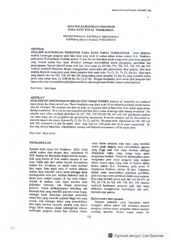 Analisis kandungan pengotor pada batu topaz teriradiasi. Telah dilakukan analisis kandungan pengotor pada batu topaz yang telah di iradiasi dalam kolam reaktor G.A. Siwabessy pada posisi IP (Irradiation Position) selama 10 jam. Hal ini dilakukan untuk mengetahui jenis unsur pengotor yang muncul ketika batu topaz di iradiasi sehingga memudahkan dalam pengerjaan pemilahan dan penyimpanan. Sampel diambil secara acak dari batu topaz lot 537, 705, 719, 728, 549, 718, 543, dan 539. Analisis kualitatif dilakukan dengan menggunakan seperangkat alat spektrometri sinar gamma. Dari hasil analisis di peroleh enam jenis unsur dalam pengotor batu topaz yaitu Fe, Cr, Sc, Ta, Ca, dan Eu. Batu topaz yang diambil dari lot 549, 718, 543, dan 539 mengandung unsur pengotor Cs dan Eu yang memiliki waktu paruh lebih yang cukup lama. Cs (2,06 th) dan Eu (13,33 th). Dengan mengetahui jenis unsur pada pengotor batu topaz maka akan memudahkan pekerjaan pemilahan dan pengiriman kembali maupun penyimpanan.