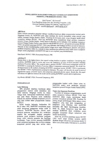 Faktor manusia merupakan penyebab tertinggi terjadinya kecelakaan dalam pengoperasian instalasi nuklir. Mengingat kondisi ini, BAPETEN perlu meninjau dan menilai kompetensi setiap personel yang terlibat, termasuk Petugas Proteksi Radiasi. Penelitian ini bertujuan untuk mengembangkan model sistem manajemen berbasis ISO/IEC 17024 bagi BAPETEN dalam menjalankan fungsi penilaian kompetensi personel Petugas Proteksi Radiasi. Model dibuat berdasarkan analisa terhadap sistem penilaian kompetensi pegawai Petugas Proteksi Radiasi yang dilakukan oleh BAPETEN saat ini, persyaratan-persyaratan ISO/IEC 17024, dan praktek penerapan ISO/IEC 17024 yang diberlakukan oleh lembaga sertifikasi personel di Indonesia. Makalah ini akan mendeskripsikan model tersebut dengan deskripsi aspek kelembagaan, personel, serta proses penilaian kompetensi. Selain itu, makalah ini akan membahas perbedaan antara model sistem manajemen dengan sistem yang dijalani oleh BAPETEN saat ini serta implikasi yang ditimbulkannya.