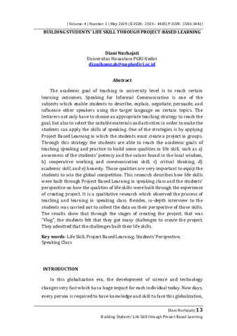Diani, Nurhajati (2019) Building students’ life skill through project-based learning. English Education : Journal of English Teaching and Research, 4 (1): 2. pp. 13-22. ISSN E-ISSN: 2503 – 4405| P-ISSN: 2580-3441