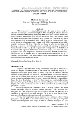Eka, Resty Novieta Sari (2019) An error analysis in writing the sentence of simple past tense on english subject. English Education : Journal of English Teaching and Research, 4 (1): 5. pp. 39-44. ISSN E-ISSN: 2503 – 4405| P-ISSN: 2580-3441
