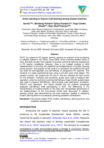 Suroto and Bambang Ferianto Tjahyo Kuntjoro and Vega Candra Dinata and Bayu Budi Prakoso (2022) Active learning to improve self-learning among student teachers. Jurnal SPORTIF: Jurnal Penelitian Pembelajaran, 8 (2): 5. 226- 240. ISSN 2548 – 7833