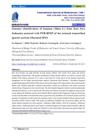 Lia Hapsari and Didik Wahyudi and Rodiyati Azrianingsih and Estri Laras Arumingtyas (2015) Genome identification of bananas (Musa L.) from East Java Indonesia assessed with PCR-RFLP of the internal transcribed spacers nuclear ribosomal DNA. International Journal of Biosciences, 7 (3). pp. 42-52. ISSN 2222-5234