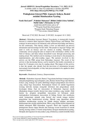 Nunik Hariyanti and Wahidah Mahanani and Mufid Salim and Fitrinanda An Nur (2023) Peningkatan literasi PKK Argosari, Sedayu, Bantul melalui membacakan nyaring. Jurnal ABDINUS: Jurnal Pengabdian kepada Masyarakat, 7 (1): 2. ISSN 2599-0764