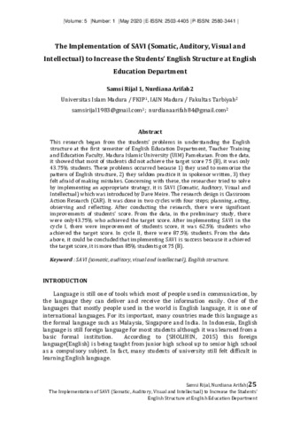 Samsi, Rijal and Nurdiana, Arifah (2020) The Implementation of SAVI (Somatic, Auditory, Visual and Intellectual) to Increase the students’ english structure at English Education Department. English Education : Journal of English Teaching and Research, 5 (1): 3. pp. 25-31. ISSN 2503-4405