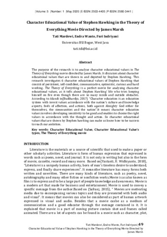Tati, Mardewi and Endra, Wanto and Furi, Indriyani (2020) Character educational value of Stephen Hawking in the theory of everything movie directed by James Marsh. English Education : Journal of English Teaching and Research, 5 (1): 6. pp. 49-61. ISSN 2503 – 4405