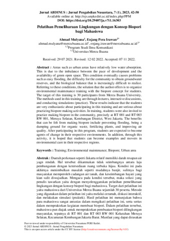 Ahmad Mulyana and Enjang Pera Irawan (2023) Pelatihan pemeliharaan lingkungan dengan konsep biopori bagi mahasiswa. Jurnal ABDINUS: Jurnal Pengabdian kepada Masyarakat, 7 (1): 5. pp. 42-50. ISSN 2599-0764