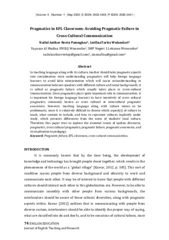 Nailul Author Restu Pamugkas and Lutfiana Tarita Wulandari (2020) Pragmatics in EFL classroom: avoiding pragmatic failure in cross-cultural communication. English Education : Journal of English Teaching and Research, 5 (1): 8. pp. 74-91. ISSN 2503 – 4405