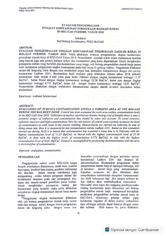 Evaluasi pengendalian kontaminasi permukaan daerah kerja di RSG-GAS periode Tahun 2010. Telah dilakukan evaluasi pengendalian tingkat kontaminasi permukaan daerah kerja di RSG-GAS Tahun 2010. Pemanfaatan instalasi senjata selain mempunyai manfaat yang banyak juga ada potensi bahaya radiasi dan bahaya yang harus diperhatikan. Untuk menghindari pemaparan radiasi yang berlebih dan kontaminasi yang tinggi, sub bidang pengendalian daerah kerja secara rutin melakukan pengukuran tingkat kontaminasi pada setiap ruang di gedung reaktor. Pengukuran dilakukan secara tak langsung yaitu dengan cara melakukan smear test, kemudian mengukurnya dengan alat survey kontaminasi Ludlum 2241. Berdasarkan hasil evaluasi yang dilakukan selama tahun 2010 terbukti kontaminasi telah terjadi 4 kali yaitu pada bulan Februari dengan tingkat ancaman tertinggi 11,37 Bq/Cm², bulan Maret dengan tingkat kontaminasi tertinggi 22,38 Bq/Cm², bulan Juni dengan tingkat kontaminasi tertinggi 6.773 Bq/Cm², bulan Juli dengan tingkat kontaminasi tertinggi 10,61 Bq/Cm². Pengendalian dilakukan dengan melakukan dekontaminasi sampai daerah tersebut dinyatakan bebas kontaminasi.