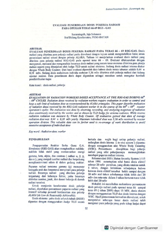 Evaluasi penerimaan dosis pekerja radiasi pada operasi teras 66-69 RGS-GAS. Dosis radiasi yang diterima para pekerja radiasi perlu dievaluasi dengan tujuan untuk mengendalikan batas aman penerimaan radiasi sesuai dengan prinsip ALARA. Tulisan ini menjelaskan evaluasi dosis radiasi yang diterima para pekerja radiasi RSG-GAS pada operasi teras 66-69. Evaluasi dilakukan dengan mengamati, mencatat dan menganalisis besarnya dosis radiasi yang secara terus menerus diterima radiasi para pekerja seperti yang ditunjukan oleh badge TLD untuk radiasi eksterna. Sedang dosis radiasi internal diukur dengan Whole Body Counter. Dari hasil evaluasi diperoleh data bahwa dosis rerata tahunan adalah 0,44 0,38 mSv. Sedang dosis individu maksimum seebesar 5,36 mSv diterima oleh radiasi dari bidang operasi reaktor. Data penerimaan dosis dapat digunakan sebagai masukan untuk mengatur kembali pendistribusian tugas