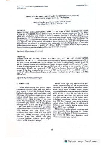 Perhitungan harga konstanta fasilitas silikon doping di Reaktor Serba Guna G.A Siwabessy. Fasilitas Silikon Doping atau fasilitas neutron transmutation dopping (NTD) adalah salah satu fasilitas yang terdapat di RSG-GA Siwabessy. Fasilitas ini dilengkapi dengan sebuah kapsul, panjang 400 mm dan diameter 178 mm yang diputar bebas di dalam tabung penyanga kapsul dengan kecepatan 15 rpm diputar oleh penggerak motor. Pada saat ini fasilitas doping silikon telah dimodifikasi, dan akan digunakan untuk produksi bahan semikonduktor tipe-n. Oleh karena itu perlu dilakukan perhitungan harga konstanta (k) fasilitas NTD. Perhitungan harga konstanta (k) telah dilakukan pada daya 15 MW. Hasil perhitungan diperoleh harga k = 4.68532,107 n/cm ±10.298,105 n/cm. Hasil ini dapat digunakan untuk referensi pembelanjaan waktu iradiasi silikon ingot di RSG GA Siwabessy.